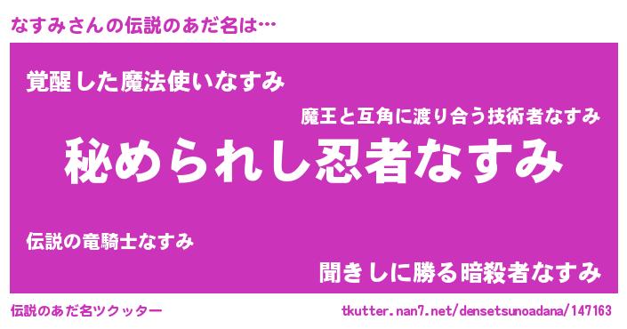| 意味不明あだ名 | 『自称なすみ』『なすみフォーエバー』 |