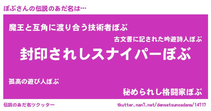 | 胡散臭い通販商品みたいなあだ名 | 『億万長者になれる霊験あらたかなお札…その名も「ぼぶ」』 |
