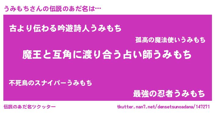 | ヒーロー風カッコイイあだ名 | 『愛の使者うみもち』『ネオウミモチ』 |