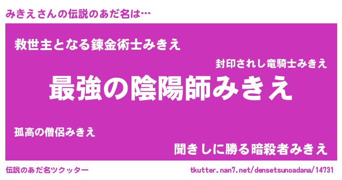 | 男性向けラノベタイトル風あだ名 | 『みきえ~年齢イコール彼女いない歴の魔法使い~』 |