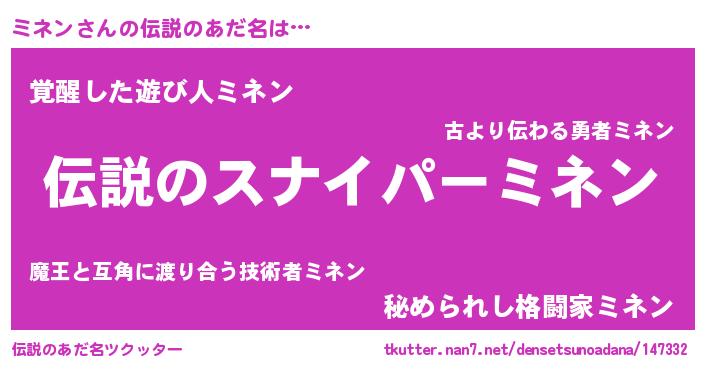 | ヒーロー風カッコイイあだ名 | 『スーパーミネン』『黄金騎士ミネ』 |