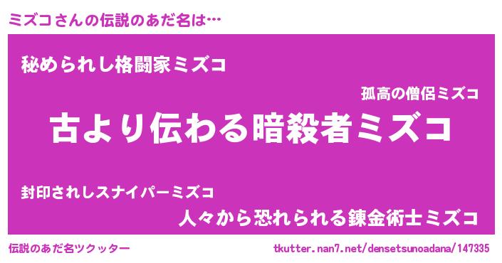 | ファンタジー風あだ名 | 『ミズディッシュ』『エターナルミズコー』 |