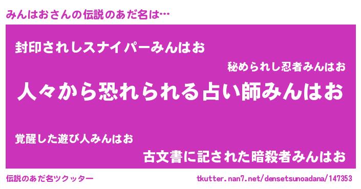 | 意味不明あだ名 | 『自称みんはお』『ペロリンみんはお』 |