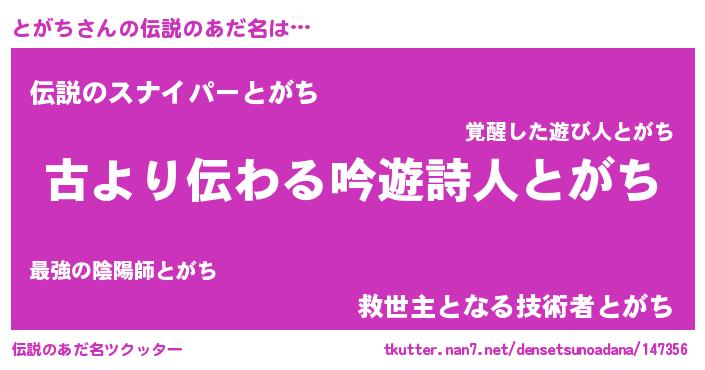 | 女子向けラノベタイトル風あだ名 | 『とがちの契約王妃』『とがち恋絵巻』 |