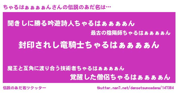| 男性向けラノベタイトル風あだ名 | 『この素晴らしい世界にちゃるはぁぁぁぁんを!』 |