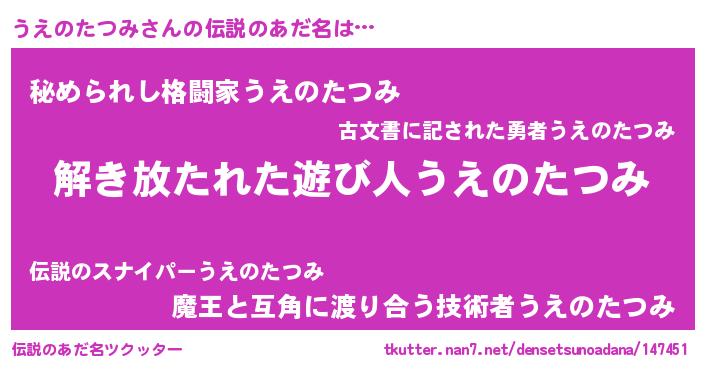 | 男性向けラノベタイトル風あだ名 | 『転生したらうえのたつみだった件』 |
