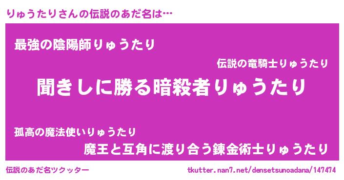 | 男性向けラノベタイトル風あだ名 | 『リュウタリスレイヤー』 |