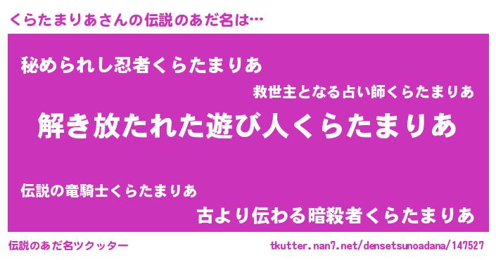 | 男性向けラノベタイトル風あだ名 | 『この素晴らしい世界にくらたまりあを!』 |