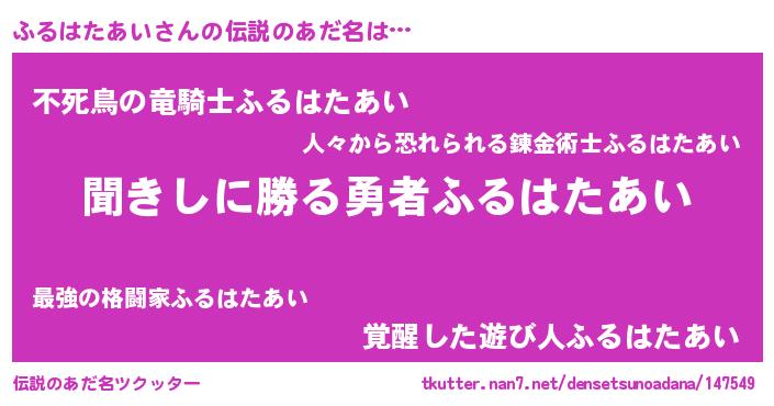 | ヒーロー風カッコイイあだ名 | 『ネオフルハタアイ』『天弓騎士フル』 |
