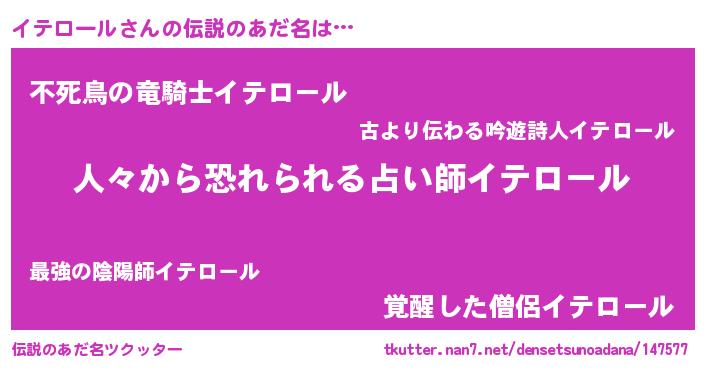 | ヒーロー風カッコイイあだ名 | 『正義の使者イテロール』『黄金騎士イテ』 |
