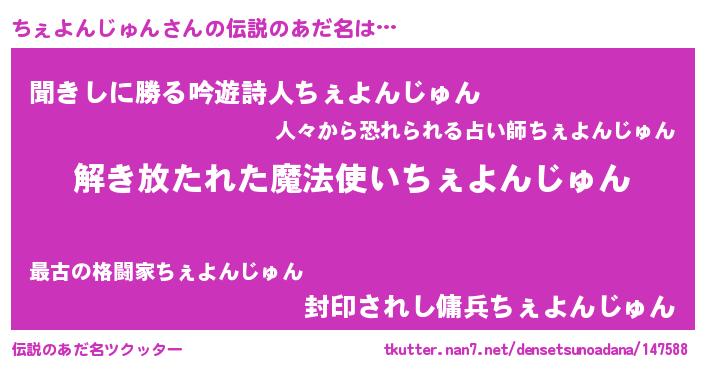 | 男性向けラノベタイトル風あだ名 | 『ちぇよんじゅんの嫁は女の子じゃないと思った?』 |