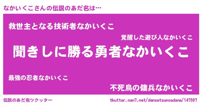 | 男性向けラノベタイトル風あだ名 | 『なかいくこという概念が存在しない退屈な世界 』 |