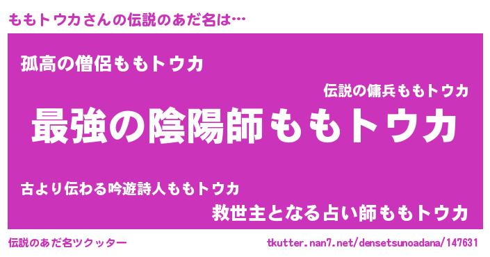 | 男性向けラノベタイトル風あだ名 | 『ももトウカに滅ぼされるだけの簡単なお仕事です』 |