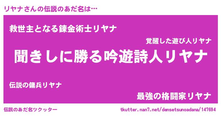 | 女子向けラノベタイトル風あだ名 | 『異世界で失敗しない100のリヤナ』 |