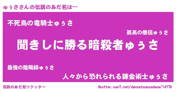 | 男性向けラノベタイトル風あだ名 | 『魔弾の王とゅぅさ』 |