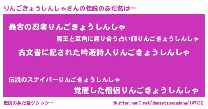 | 意味不明あだ名 | 『住所不定無職りんごきょうしんしゃ(4歳)』 |