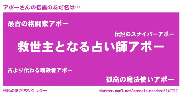 | ヒーロー風カッコイイあだ名 | 『慈愛の使者アポー』『仮面アポダー』 |