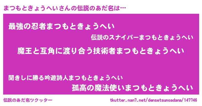 | ヒーロー風カッコイイあだ名 | 『慈愛の使者まつもときょうへい』 |