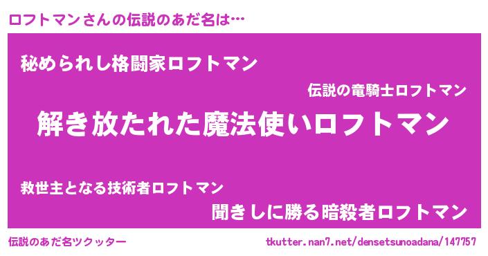 | 男性向けラノベタイトル風あだ名 | 『ロフトマンの嫁は女の子じゃないと思った?』 |