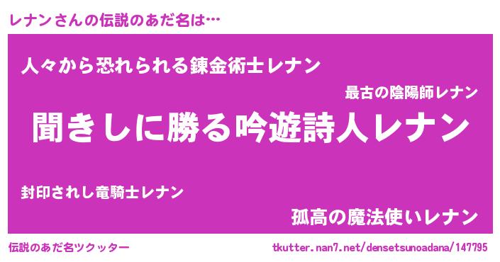| 男性向けラノベタイトル風あだ名 | 『レナンという概念が存在しない退屈な世界 』 |
