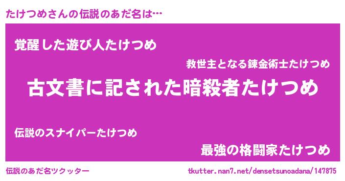 | 意味不明あだ名 | 『自称たけつめ』『永久保存たけつめ』 |