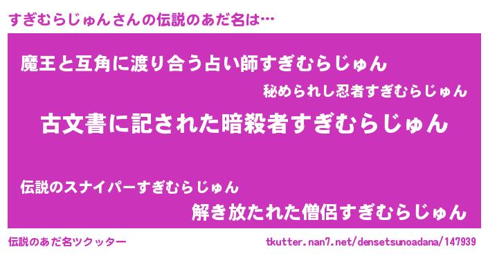 | 男性向けラノベタイトル風あだ名 | 『すぎむらじゅん~年齢イコール彼女いない歴の魔法使い~』 |