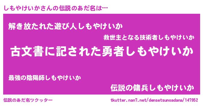 | 意味不明あだ名 | 『永久保存しもやけいか』 |