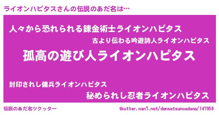 | 胡散臭い通販商品みたいなあだ名 | 『信頼と実績のペンダント…その名も「ライオンハピタス」』 |