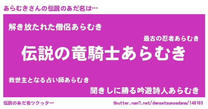 | 男性向けラノベタイトル風あだ名 | 『あらむきの憂鬱』『魔弾の王とあらむき』 |