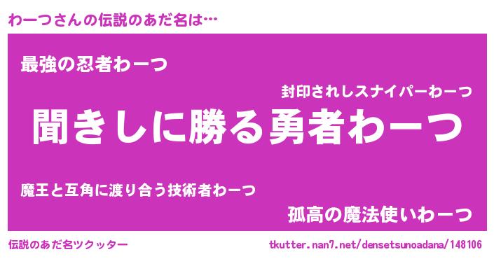 | 男性向けラノベタイトル風あだ名 | 『魔弾の王とわーつ』 |