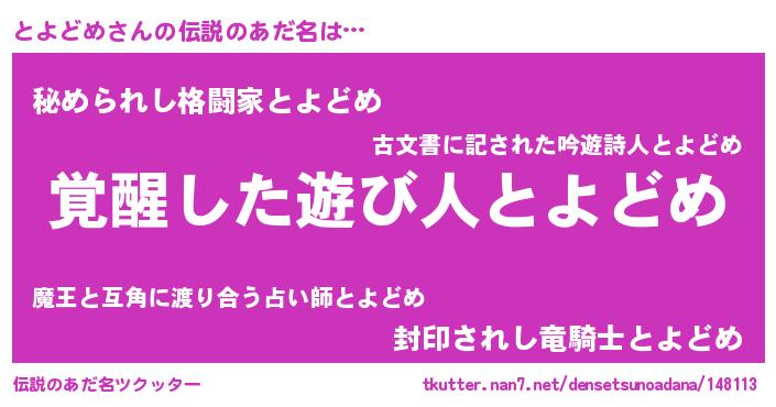 | 男性向けラノベタイトル風あだ名 | 『Re:とよどめから始める異世界生活』 |