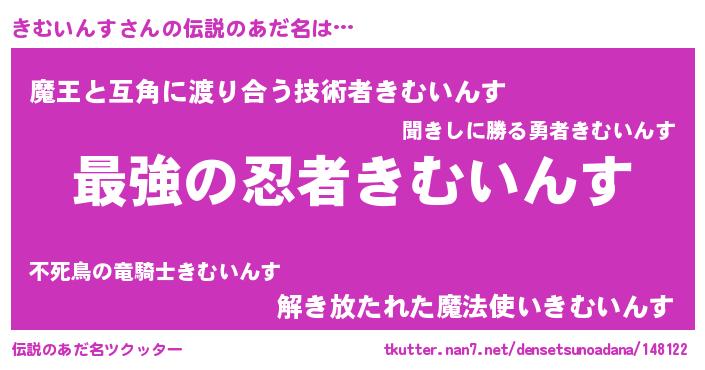 | 男性向けラノベタイトル風あだ名 | 『うちのきむいんすが世界を掌握している!』 |