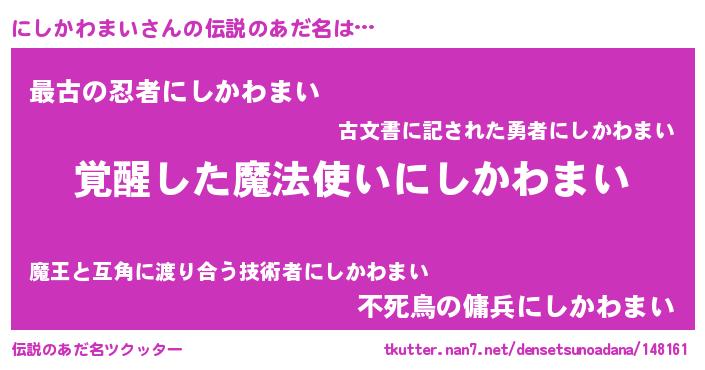 | 胡散臭い通販商品みたいなあだ名 | 『全米が絶賛したサプリメント…その名も「にしかわまい」』 |