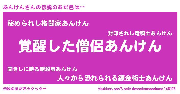| 男性向けラノベタイトル風あだ名 | 『この素晴らしい世界にあんけんを!』 |