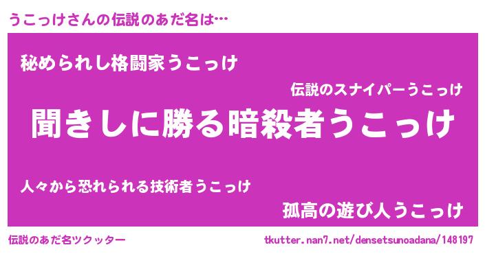 | 男性向けラノベタイトル風あだ名 | 『うこっけという概念が存在しない退屈な世界 』 |