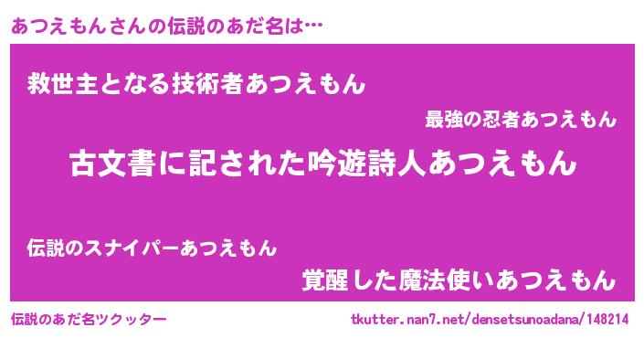 | 意味不明あだ名 | 『永久保存あつえもん』『自称あつえもん』 |
