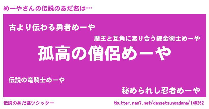 | 男性向けラノベタイトル風あだ名 | 『メーヤスレイヤー』 |