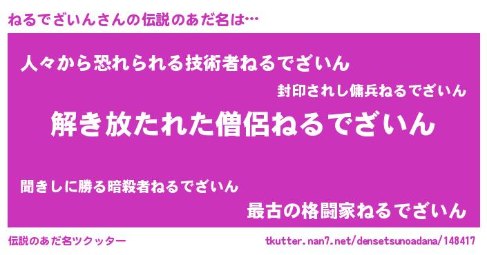| 女子向けラノベタイトル風あだ名 | 『ねるでざいんの卵を拾いまして』 |