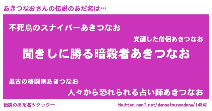 | 意味不明あだ名 | 『永久保存あきつなお』『自称あきつなお』 |