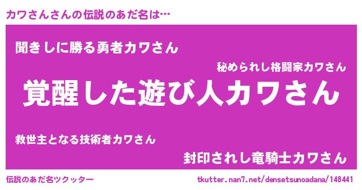 | 意味不明あだ名 | 『自称カワさん』『永久保存カワさん』 |