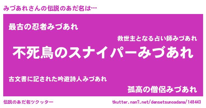 | 男性向けラノベタイトル風あだ名 | 『魔弾の王とみづあれ』『みづあれの憂鬱』 |