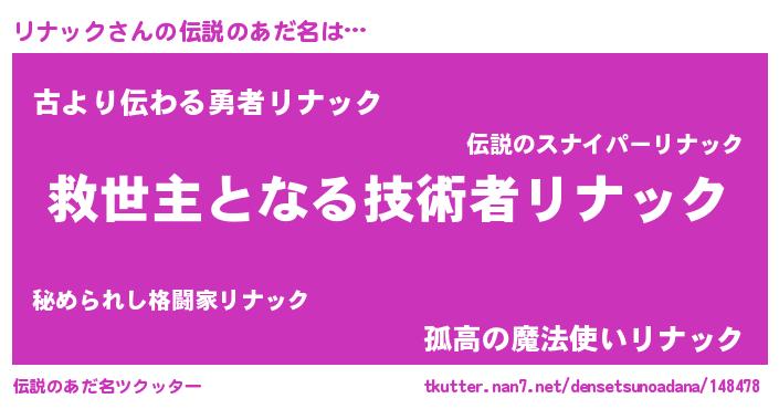 | 男性向けラノベタイトル風あだ名 | 『この素晴らしい世界にリナックを!』 |
