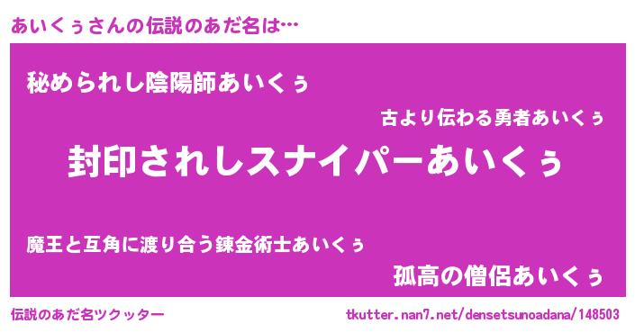 | 男性向けラノベタイトル風あだ名 | 『あいくぅ~年齢イコール彼女いない歴の魔法使い~』 |