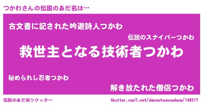 | ヒーロー風カッコイイあだ名 | 『天空の使者つかわ』『ネオツカワ』 |