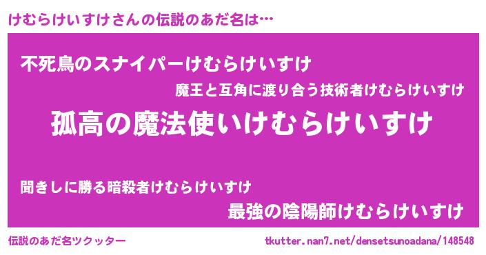 | 女子向けラノベタイトル風あだ名 | 『けむらけいすけは平凡を望む』 |