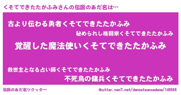 | 胡散臭い通販商品みたいなあだ名 | 『全米が絶賛したサプリメント…その名も「くそてできたたかふみ」』 |