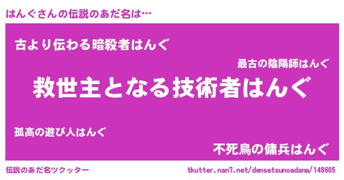 | 女子向けラノベタイトル風あだ名 | 『死神はんぐの再婚』『はんぐの契約王妃』 |