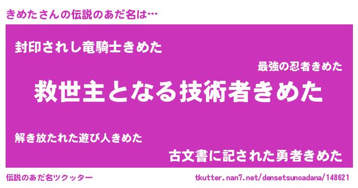 | ヒーロー風カッコイイあだ名 | 『仮面キメダー』『慈愛の使者きめた』 |