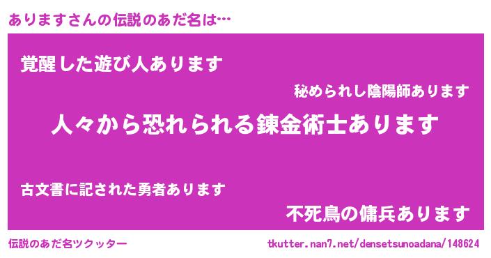 | ヒーロー風カッコイイあだ名 | 『友情の使者あります』『炎刃騎士アリ』 |