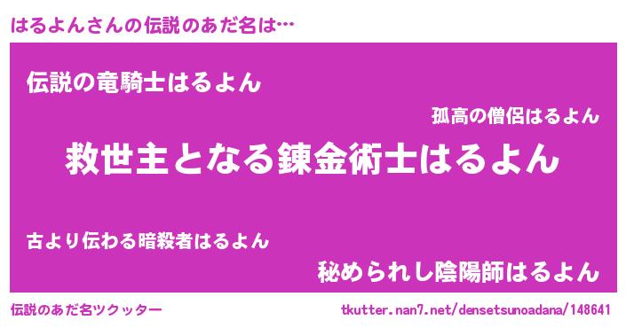 | 男性向けラノベタイトル風あだ名 | 『はるよんに滅ぼされるだけの簡単なお仕事です』 |
